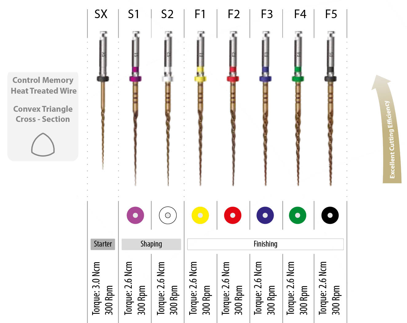 • Σταδιακή αλλαγή κωνικότητας, βοηθάει στην διαμόρφωση του ριζικού σωλήνα και μειώνει την ζώνη επαφής μεταξύ της ρίνης και της οδοντίνης, βελτιώνοντας κατά τέτοιο τρόπο την αποτελεσματικότητα και μειώνοντας την πιθανότητα θραύσης του εργαλείου.